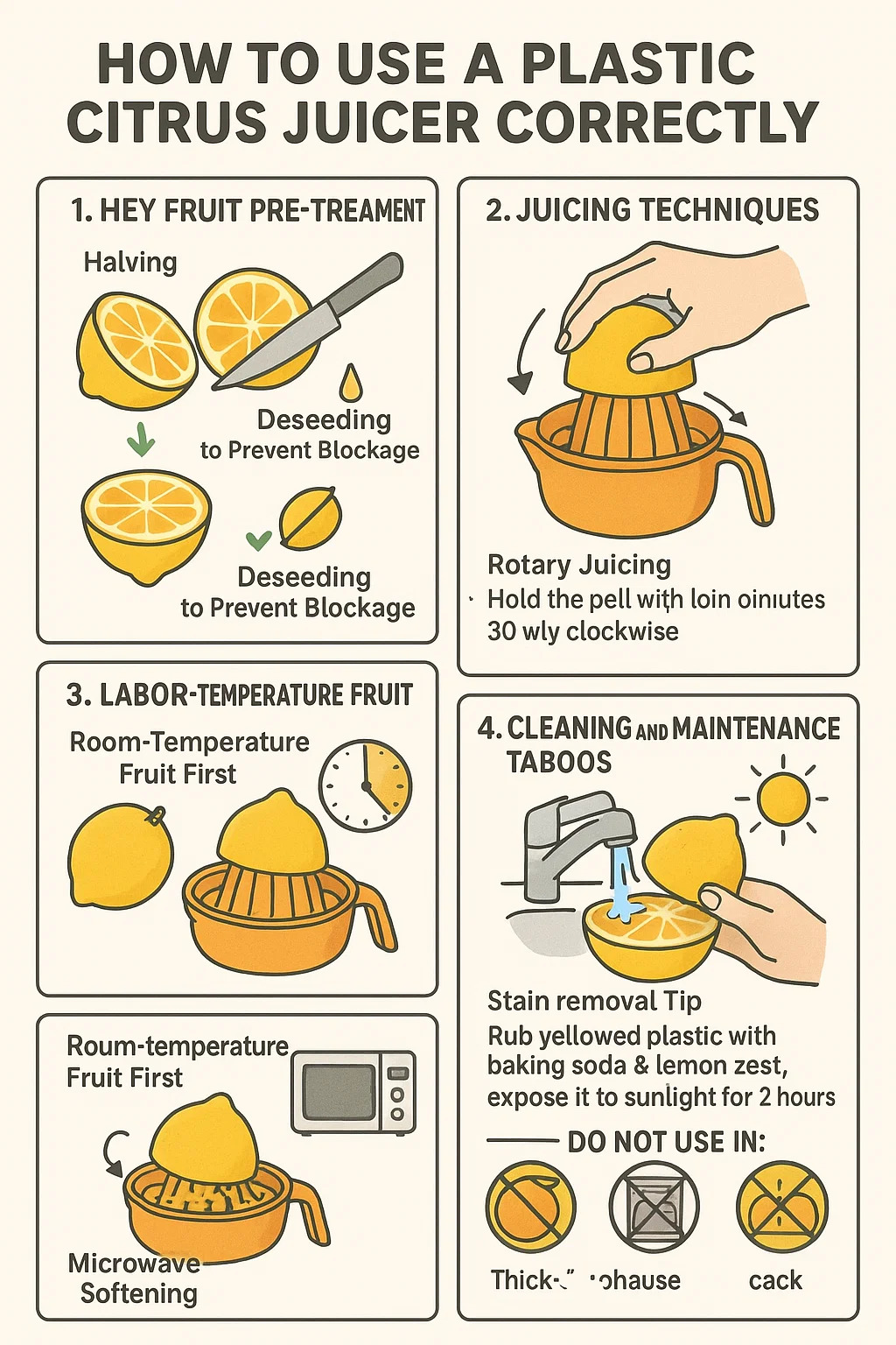 Rinse immediately to prevent staining: Rinse immediately with cold water after squeezing (hot water accelerates the penetration of the fruit oil into the plastic, causing it to yellow).