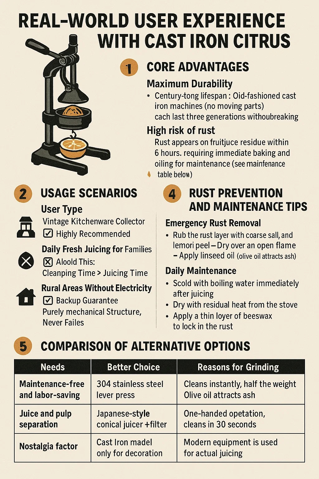 | Nostalgic aesthetic | Display Cast Iron Only | • Use modern juicers for actual pressing• Prevents toxic rust ingestion in food |