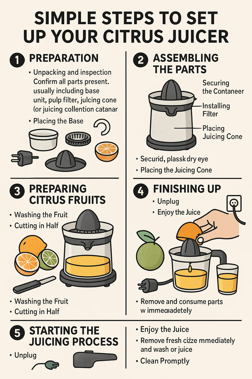 Unpacking and Inspection: First, take your citrus juicer out of the box. Confirm that all parts are present, usually including the base unit, pulp filter, juicing cone (or juicing head), and juice collection container.