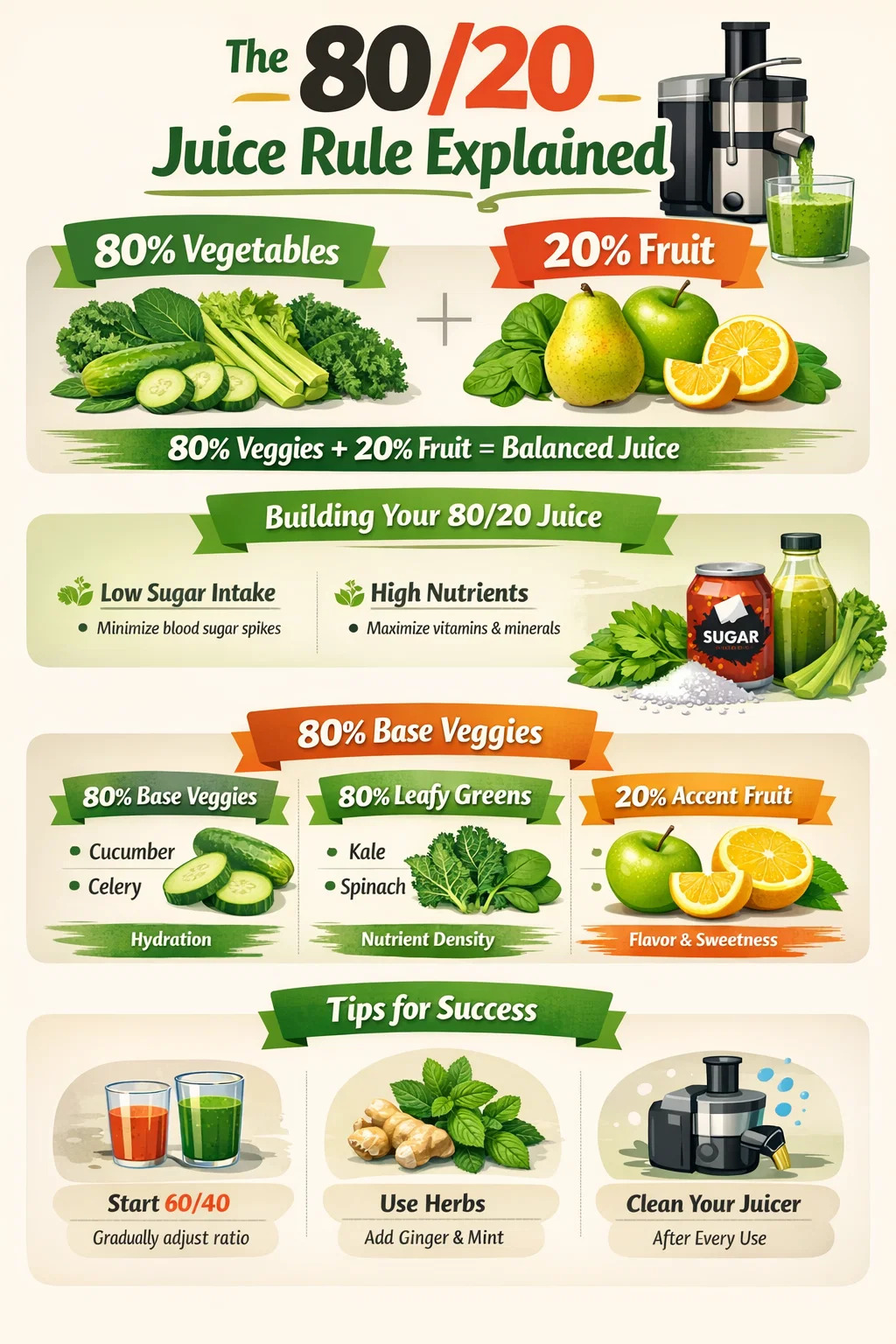 The 80/20 rule for juicing is a nutritional guideline stating that for every glass of juice you produce, 80% of the ingredients should be vegetables and only 20% should be fruits. This ratio is designed to maximize the intake of phytonutrients and minerals while strictly limiting the consumption of fructose. While using a high-quality juicer makes it easy to create delicious concoctions, relying too heavily on sweet fruits can lead to unwanted blood sugar spikes, defeating many of the health purposes of fresh extraction.