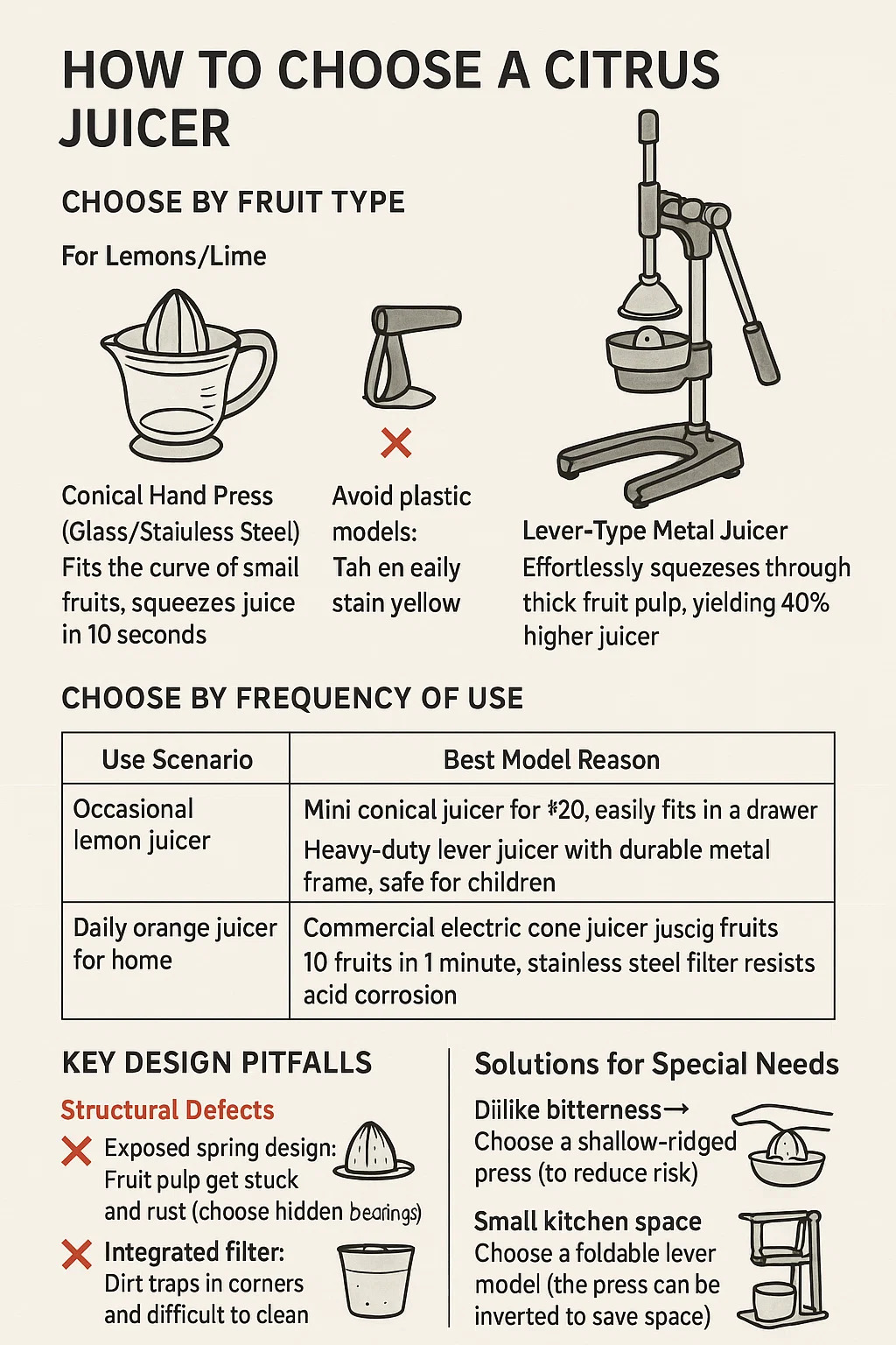 Small kitchen space → Choose a foldable lever model (the press can be inverted to save space). Keep the pulp → Use a manual model without a filter and let the pulp fall directly into the cup.